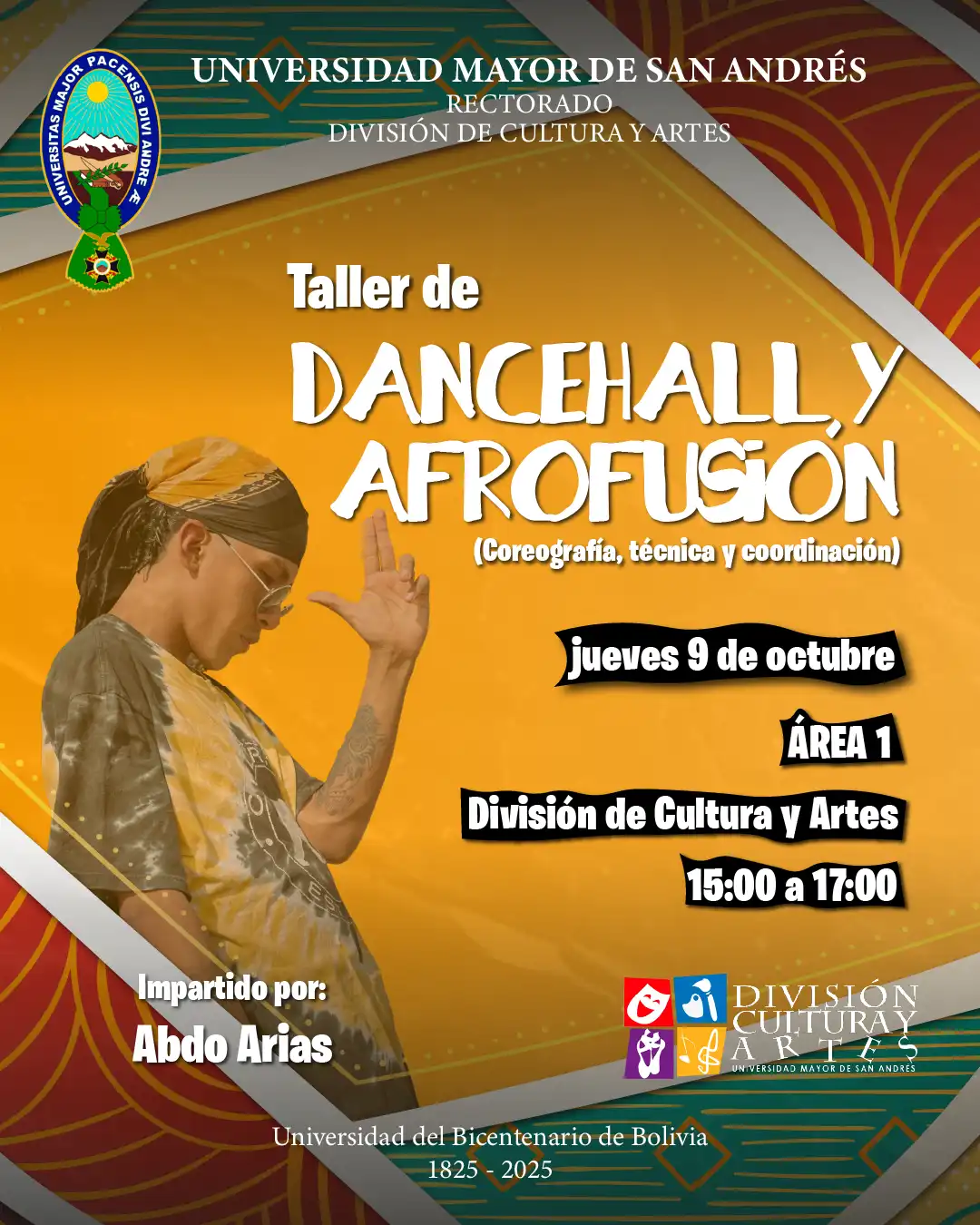La División de Cultura y Artes de la UMSA te invita al Taller de Dancehall y Afrofusión 💃🏾🕺🏾, donde aprenderás coreografía, técnica y coordinación en un espacio lleno de ritmo y energía.